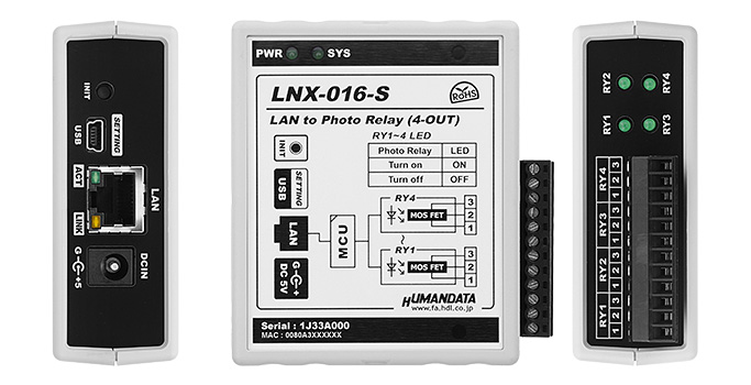 LNX-016シリーズは、簡単な制御コマンドによりLAN(有線ネットワーク)経由で、4つのPhotoリレーのON/OFF出力が可能な製品です。最大4台までのマルチ接続に対応しており、複数のPCから出力機器を制御することもできます。PoE(Power over Ethernet)対応モデルやワイド電源対応モデルなど、電源供給の仕様に応じて選択できる3型をラインナップしています。