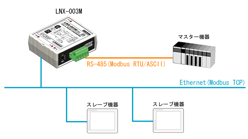 LNX-003Mは、RS-485をLANに接続するModbus専用のコンバータです。Modbus TCPからModbus RTU/ASCIIへの相互プロトコル変換を行い接続することができます。マスターまたはスレーブとして動作し、Modbus機器をイーサネット上で接続することができます。Modbusは、シリアル機器およびイーサネット機器の両方に使用可能ですが、シリアル通信とイーサネット通信の物理的な接続だけでなくプロトコルも異なるため、相互接続するためにはプロトコル変換も必要です。LNX-003Mにより、Modbus TCPとModbus RTU/ASCIIネットワークを統合することができます。