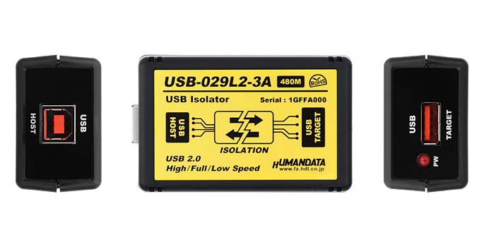 USB-029L2-3Aは、USB2.0のHigh Speed (480Mbps) にも対応したUSBアイソレータです。USBインタフェースを絶縁する装置であり、PCとUSB機器の間を絶縁することができます。